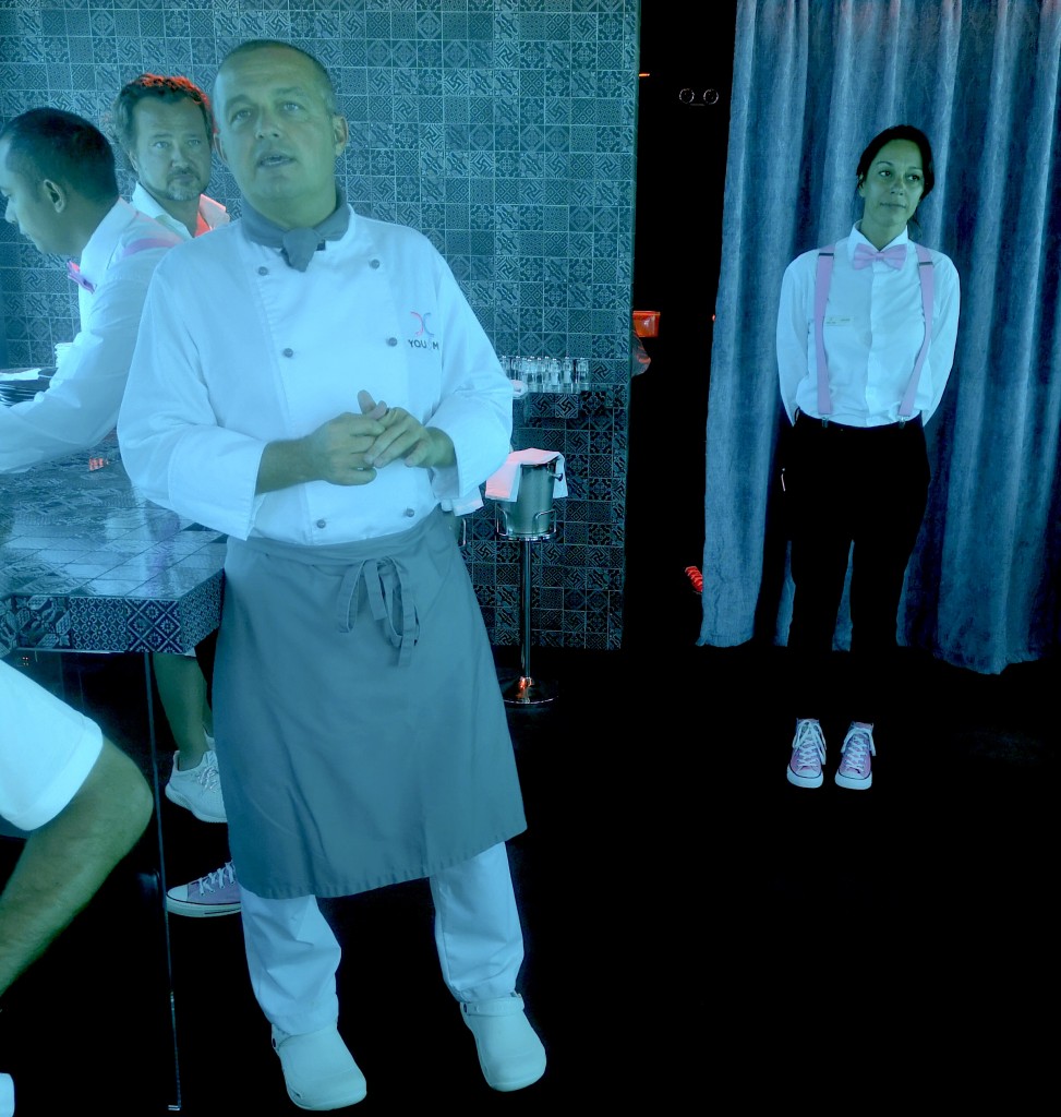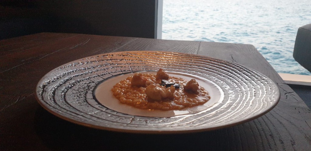 E’ qui che l’equipe coordinata dal corporate chef, Giovanni De Ambrosis, assieme ai due giovani assistenti Daniele Provezza da Brescia, che si occupa dell’ H2O, e Davide Bassi da Milano entrambi venticinquenni e molto promettenti, mette in campo tutta la propria capacità di stupire i commensali con manicaretti molto sofisticati, ancora più apprezzabili per ambientazione, servizio e piacevolezza dei vostri anfitrioni, coordinati dalla deliziosa Laura Busnari, “H2O ambassador”, riconoscibile dal papillon, bretelle, All star, tutto rosa.