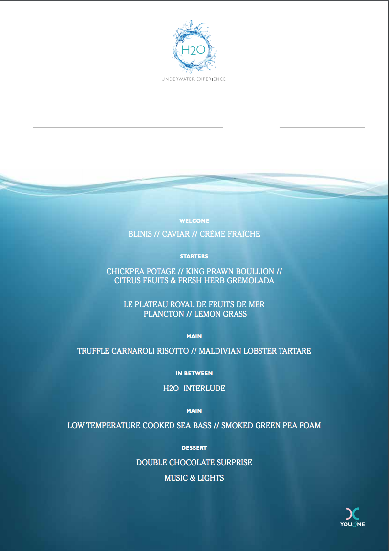 L’H2O è un ristorante sottomarino, “primo del suo genere”, completamente sommerso, che regala, in un ambiente dagli arredi raffinatissimi sui toni del nero e del grigio, ai commensali, la veduta delle Maldive da sott’acqua, ma perfettamente asciutti, protetti da un guscio di spesso pexiglas, circondati da un mondo che pullula di vita. Un’osservazione stupefacente e privilegiata mentre ci si gode un pasto pregiato, con cinque portate a pranzo e sette a cena (180/280 usd).