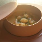 Blinis al caviale Osetra, potage di ceci, gremolada e gamberi reali