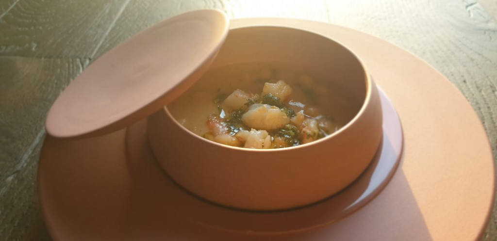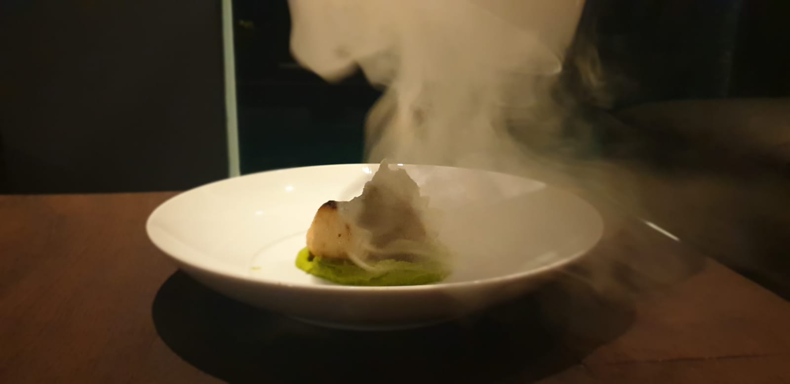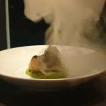 Filetto di branzino con purea di piselli affumicata,