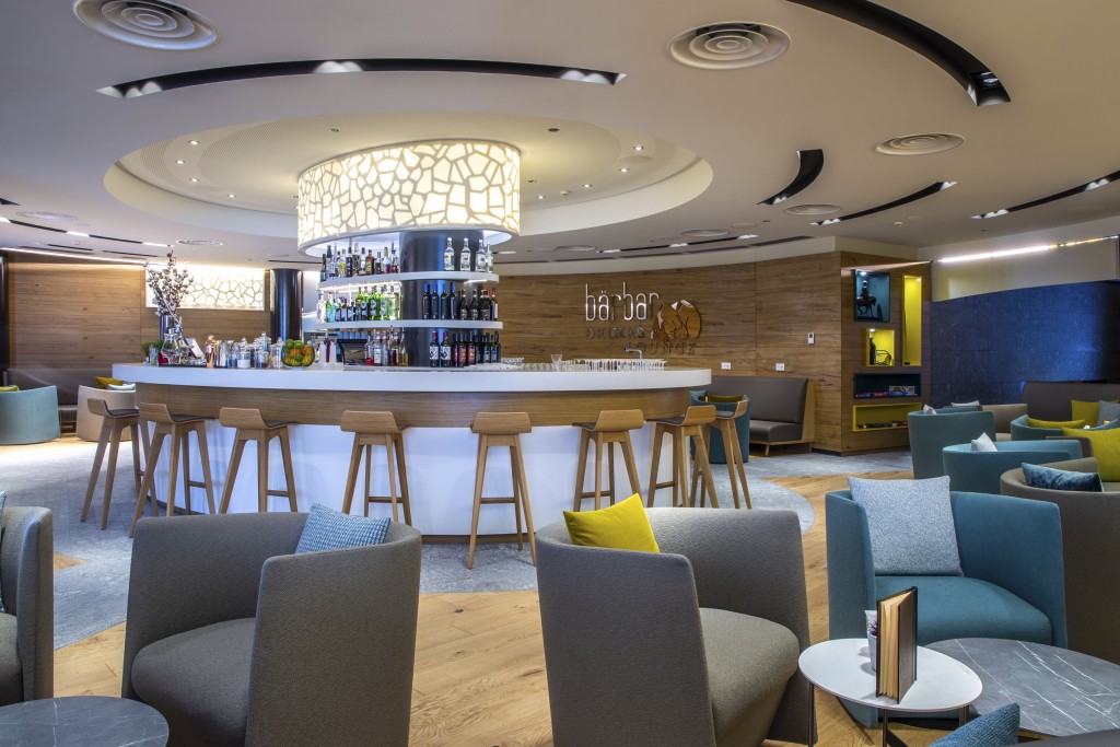 Attorno a un importante caminetto si sviluppa con comodi divani e un bancone circolare il Bärbar, luogo deputato a un drink o un pasto leggero o snack, accompagnati da una ampia selezione di vini, birre artigianali e cocktail di ogni genere.