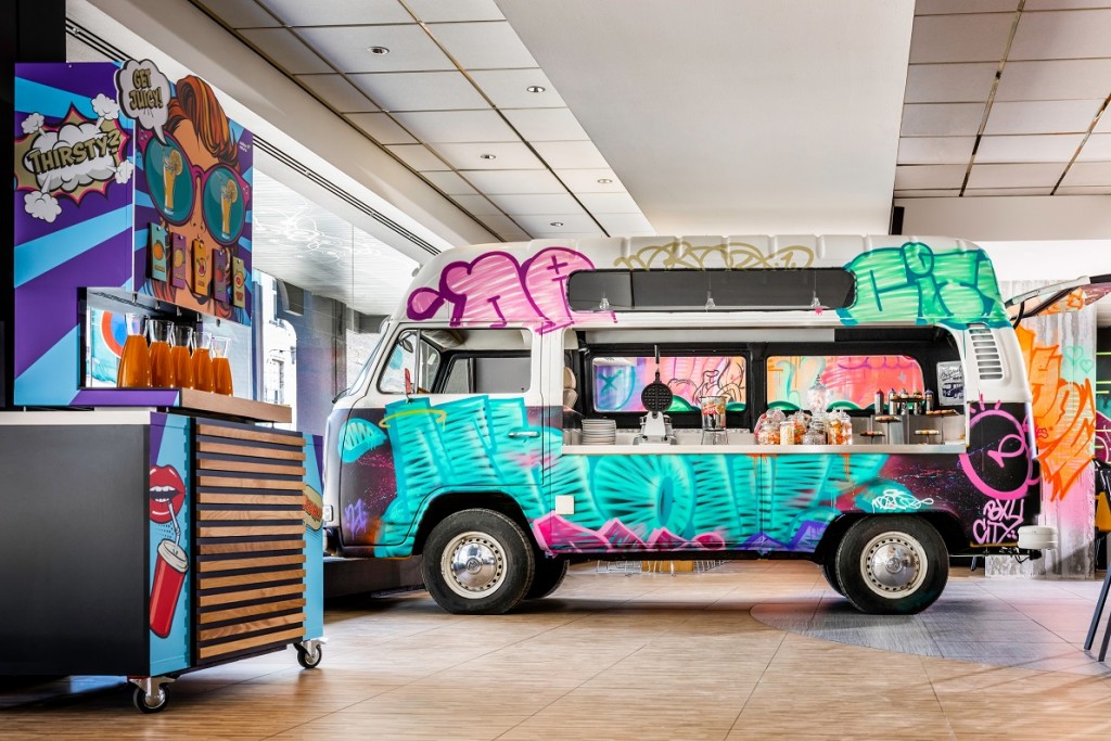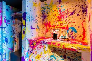 si è accolti da un’esplosione di colori e stampe, mentre la zona notte è proprio come una tela bianca in attesa di essere interpretata. Ogni camera è decorata con un quadro diverso che cattura lo sguardo grazie allo sfondo neutro delle pareti. I bagni si ispirano invece alla camera oscura di un fotografo: misteriosi, scuri e con una spruzzata di colore qua e là. Tocco di creatività, le Polaroid sul muro che invitano gli ospiti a essere creativi anche nella stanza da bagno. Ogni piano è poi ispirato a una forma d’arte diversa. Usciti dall’ascensore, si è completamente immersi in un tema artistico specifico. Jessica Thacker, artista londinese, ha già interpretato il settimo piano con i suoi dipinti astratti ispirati alla musica, mentre altri artisti emergenti sono pronti per condividere la loro creatività negli altri piani.