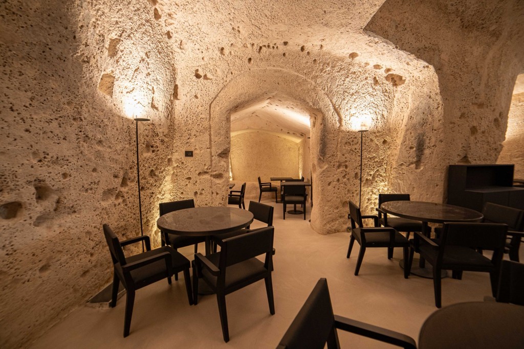 Le camere ipogee, scavate nella roccia, offrono un’esperienza di quiete e raccoglimento. Nelle zone più alte altre stanze si affacciano sugli scorci dei Sassi. Il ristorante, ricavato in una sala sotterranea, propone un viaggio gastronomico alla scoperta dei sapori lucani, reinterpretati dallo chef Eduardo Estatico con la precisa volontà di valorizzare i prodotti del territorio. La cantina custodisce un’ampia selezione di vini, per un’esperienza enologica che celebra la ricchezza del terroir.