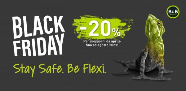 B&B Hotels lancia la sua offerta Black Friday per ricominciare a pianificare i viaggi, visitare nuovi luoghi, e usufruire di tutti i servizi e i comfort delle strutture del gruppo in Italia con un significativo risparmio. Una promo dedicata a tutti coloro che desiderano prenotare i prossimi soggiorni primaverili ed estivi al miglior prezzo, all’insegna della flessibilità e della sicurezza. La tariffa Black Friday sarà disponibile dal 27 novembre al 4 dicembre 2020 incluso e assicura uno sconto del 20% per soggiorni dal 1° aprile al 31 agosto 2021.
