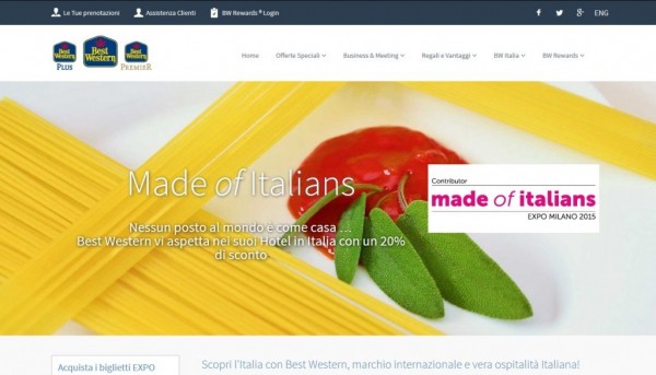 Best Western, in qualità di rivenditore autorizzato Expo, è Contributor di “Made of Italians” programma dedicato a tutti i cittadini italiani che risiedono fuori dal nostro Paese e desiderano visitare l’Italia durante il semestre del grande evento di Milano. Il gruppo alberghiero per l’occasione ha realizzato una promozione che garantisce il 20% di sconto per i soggiorni negli hotel italiani a tutti i nostri connazionali residenti all’estero. L’offerta è valida in tutti i 180 hotel presenti in 120 destinazioni in tutta Italia fino al 31/10/2015 per tutto il semestre di Expo Milano 2015. Per usufruire della promozione, è sufficiente scrivere una mail a marketing@bestwestern.it e richiedere il codice riservato da utilizzare al momento della prenotazione. Per ottenere lo sconto è necessario presentare al check-in un documento di identità che attesti la cittadinanza italiana con residenza all’estero. Per prenotare dall’estero: