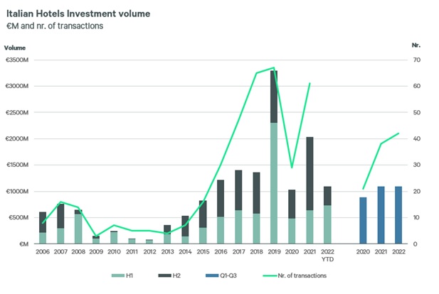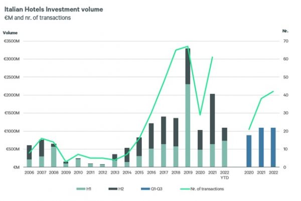 In termini di outlook, l’attività di sviluppo in essere nel settore lusso ed extra lusso e le aperture di catene alberghiere internazionali di questa fascia fanno sperare in una pipeline di investimenti ambiziosa per i prossimi 18/24 mesi, nonostante l’aumento dei prezzi delle materie prime e dei costi di costruzione. Si continuano poi a vedere sul mercato opportunità value-add: un trend che si attende in crescita anche per il 2023. “Noi di Cbre – prosegue Calia – siamo per esempio concentrati su tre importanti transazioni nel centro di Roma in chiusura attesa entro la prima metà del 2023, per un valore complessivo di oltre 500 milioni di euro (tra acquisizione e costo di ristrutturazione), relativi alla conversione di tre immobili uffici a hotel nel segmento luxury-lifestyle. I capitali internazionali continueranno a predominare nel mercato degli investimenti alberghieri in Italia, rappresentando ormai circa l’80% delle transazioni nel Paese. Le operazioni core in asset alberghieri a reddito e stabilizzati continueranno invece a scarseggiare, sia per la limitata offerta di prodotto di qualità con queste caratteristiche, sia per l’elevato costo del denaro che si riflette in un forte innalzamento dei rendimenti attesi e conseguenti richieste di repricing, che fanno fatica a essere assorbite dal venditore tipico italiano rappresentato da privati e famiglie”.