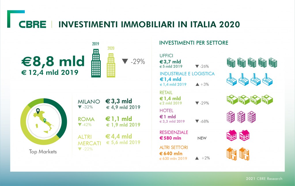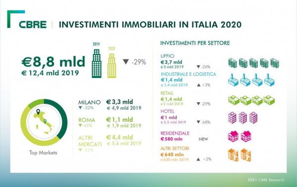 L’interesse si è allora concentrato su prodotti core in location prime mentre sono pochissime le operazioni value-add. La quota di investitori stranieri si è poi ridotta al 58% rispetto a una media del 69% negli ultimi cinque anni. Il dato non segnala un minore interesse per il mercato italiano, ma un atteggiamento probabilmente più prudenziale e cautelativo dovuto alla situazione di incertezza causata dalla pandemia. Sono rimaste per lo più invariate, invece, le abitudini di investimento degli investitori italiani, che hanno manifestato maggiore fiducia nel mercato locale a dispetto delle incertezze del periodo, superando leggermente il volume investito nel 2019 e portando a compimento importanti operazioni, come l’acquisto del Palazzo delle Poste, lo storico trophy asset in Ppiazza Cordusio a Milano, da parte di un club deal di investitori coordinato da Mediobanca.