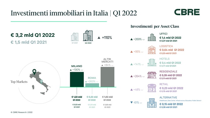 Lo rivela l’ultimo report sugli investimenti nel commercial real estate Italia sui primi tre mesi del 2022 realizzato da Cbre. Complessivamente il macro-settore, che comprende anche le asset class uffici, logistica, retail, residenziale e alternative, ha registrato un volume delle operazioni totali pari a 3,2 miliardi di euro, più del doppio rispetto a quanto registrato alla fine del primo trimestre del 2021 (1,5 miliardi). Su base storica, recita una nota della società, è il primo trimestre migliore di sempre.