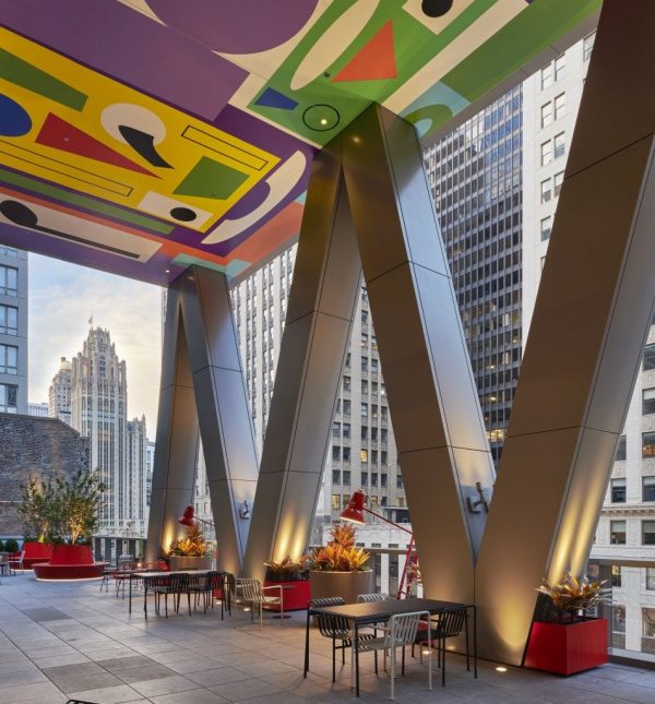 Per celebrare l’arrivo di citizenM, l’artista Nina Chanel Abney, originaria di Chicago, è stata incaricata di trasformare le pareti d’ingresso e la terrazza esterna dell’edificio, di ben 2 mila metri quadrati, in un gigantesco tributo alla città. Il suo lavoro è ispirato dalle dinamiche del panorama mediatico contemporaneo e affronta temi come razza, genere e politica. Conosciuta per i suoi dipinti, le stampe e i murales su larga scala con composizioni stratificate, le sue opere figurative presentano simboli e forme geometriche colorate e spigolose.