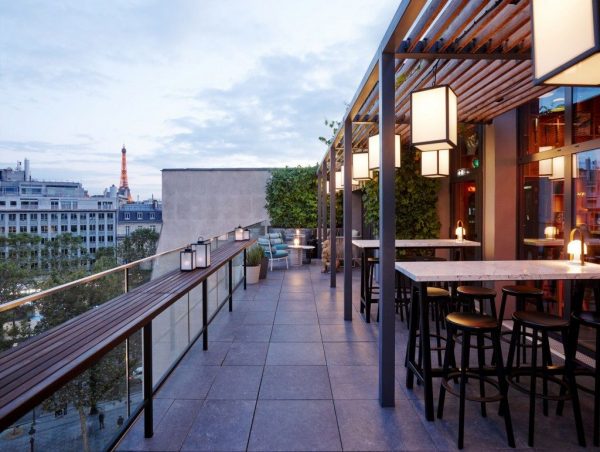 L’area living è inoltre suddivisa in isole in cui lavorare e rilassarsi, con centinaia di libri, oggetti interessanti e una cucina 24/7 posta al centro. Conosciuta come canteenM, serve cibo, bevande e snack – quasi tutti di provenienza locale – pasti caldi à la carte, cocktail artigianali e caffè, espandendosi sul già citato cortile interno con mobili in stile parigino. Il citizenM Paris Champs-Élysées vanta poi ben tre spazi all’aperto: il cortile al piano terra, la terrazza canteenM e il bar sul tetto cloudM con vista sulla torre Eiffel, dalle atmosfere fresche e casual.