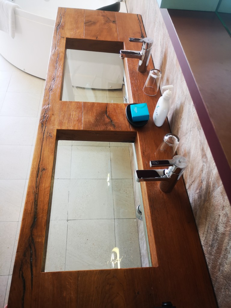 Un particolare del doppio lavabo con fondo in vetro