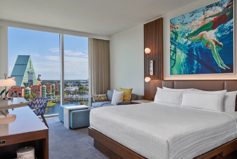 Il complesso sorge vicino a Epcot e ai Disney’s Hollywood Studios; alle sue spalle si trovano il Disney’s Animal Kingdom e il Magic Kingdom Park. È costituito da tre distinti edifici, con altrettante diverse offerte di accoglienza, 23 ristoranti e lounge internazionali e la Mandara Spa. Le camere sono in totale 2.619. Il resort dispone di sei piscine, di tre centri benessere e del vicino golf. «Il primo edificio, il Walt Disney World Swan (756 camere che possono ospitare fino a quattro persone ciascuna) è un Westin di media grandezza – spiega Livia Cohen -. Il Walt Disney World Dolphin (1.514 camere fino a cinque ospiti) è uno Sheraton ed è il più grande; verrà rinnovato tra un anno e al suo interno realizzeremo un nuovo centro convegni. Il Walt Disney World Swan Reserve (349 camere fino a otto ospiti per suite) è un Autograph Collection.