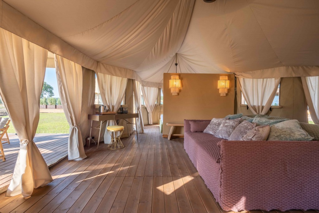 Focus infine sulla sostenibilità: tutte le tende sono infatti rimuovibili e ogni aspetto del glamping è stato studiato per avere il minore impatto ambientale possibile; gli edifici che ospitano le aree comuni sono stati realizzati interamente in legno con tecniche costruttive a secco, il resort è alimentato al 100% da fonti rinnovabili e ha preferito all’aria condizionata i ventilatori, meno inquinanti ed eleganti.