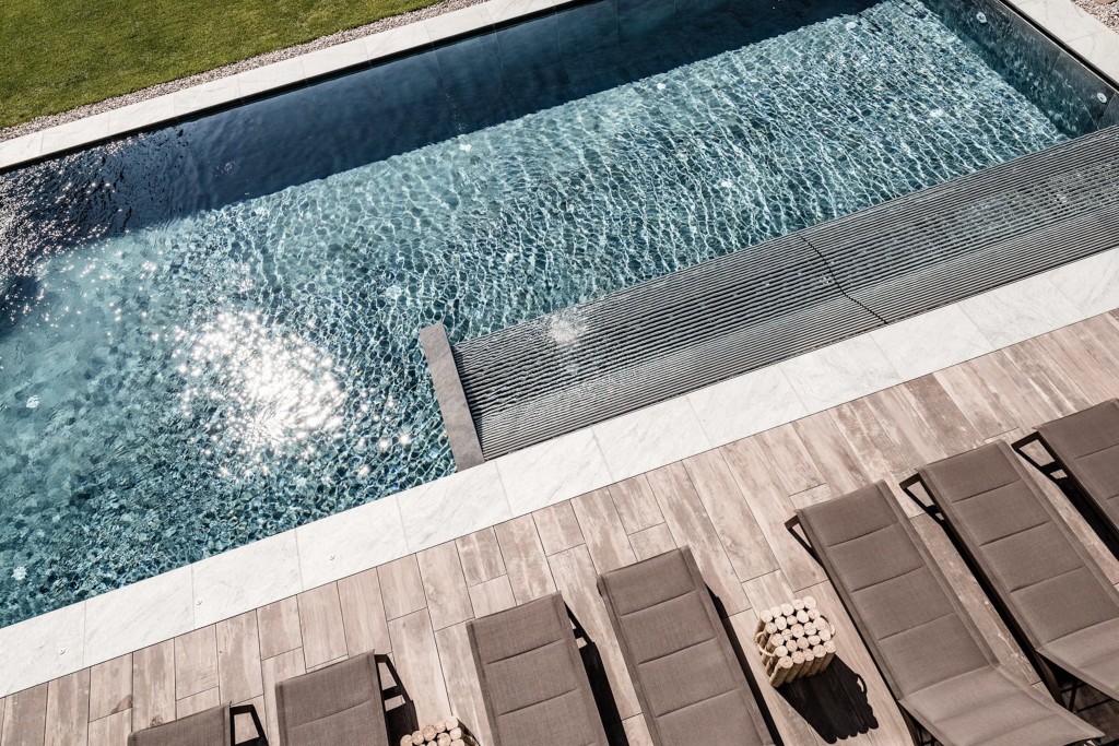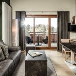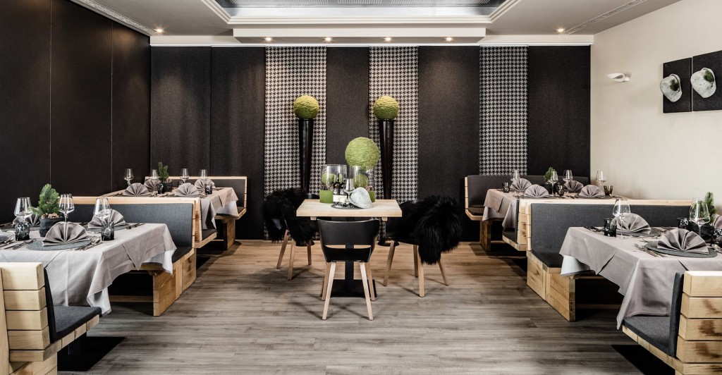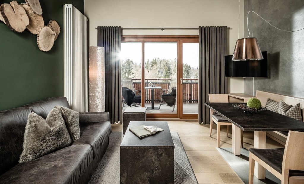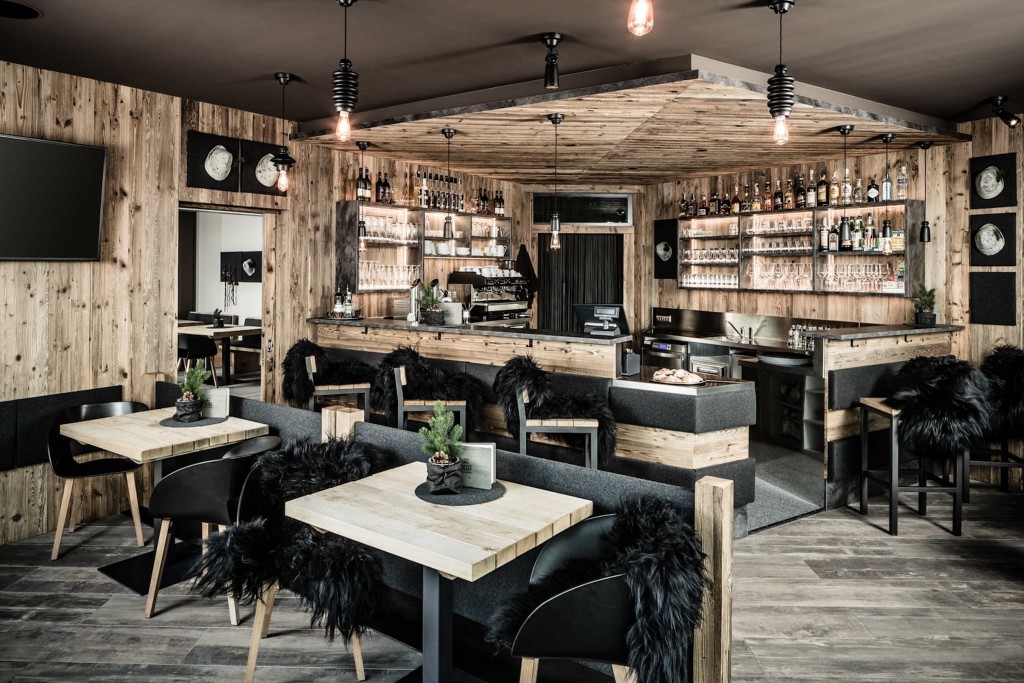 La struttura ripensa lo stile di montagna, nell’interior design, per creare un ambiente elegante ma rilassato e informale con l’utilizzo di tanto legno grezzo e il recupero del “classico loden”.