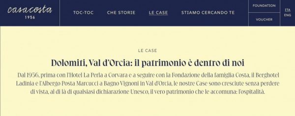 Un contenitore, un susseguirsi di idee, immagini e pensieri con i quali fabbricare ponti in direzione dell’ospitalità. E’ questo l’obiettivo di Casa Costa: nuovo progetto editoriale, online dallo scorso 10 giugno, dell’omonima famiglia di albergatori che possiede e gestisce tre strutture tra Corvara (La Perla e Berghotel Ladinia) e il Posta Marcucci in val d’Orcia. “Nel corso degli anni abbiamo dimostrato la nostra capacità di abitare, che equivale a ospitare – spiega una nota del gruppo -. Il nostro obiettivo è avere cura delle persone, e la meta a cui auspichiamo è trasmettere una benefica serenità in ogni luogo che abitiamo. Casa Costa è un’idea di casa comune in cui poter esprimere idee, riflessioni e incontrare gli ospiti: dalle Dolomiti alla Val d’Orcia”.