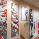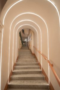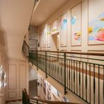 Gli studenti hanno creato affreschi site-specific distribuiti lungo i quattro piani dell’hotel, tra cui spiccano le iconografie femminili di Francesco Carlucci, gli acquerelli delicati di Alessia Bonamano e le “nuvole di Roma” di Giulia D’Ippolito, che trasformano il corridoio dell’ultimo piano in un percorso poetico.