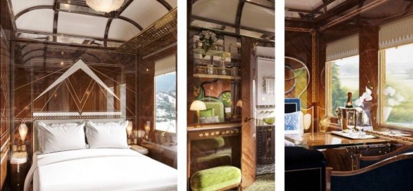 Le suite intendono celebrare l’incanto del paesaggio che si dispiega attraverso i finestrini del treno. Partendo da questa ispirazione, gli artigiani francesi hanno dato forma a quattro diversi design: la Campagne (la campagna), les Montagnes (le montagne), les Lacs (i laghi) e la Forêt (la foresta). In omaggio ai viaggi del Venice Simplon-Orient-Express, le suite ispirate a la Forêt riecheggiano la Foresta Nera, immersa nella regione montuosa del sud-ovest della Germania, come nel percorso intrapreso viaggiando da Praga a Parigi. Dalla natura selvaggia a quella più dolce, le suite ispirate a la Campagne sono adornate con vivaci velluti verdi e intricati intarsi floreali. Qui i viaggi più panoramici prendono vita attraverso il design: dai pascoli e dai vigneti del Nord Italia al panorama pittoresco del Sud della Francia e lungo la Costa Azzurra. Sul percorso classico del treno per Venezia si può ammirare il massiccio dell’Arlberg in Austria e il design di les Montagnes rispecchia le imponenti cime montuose circostanti. Dalla terra all’acqua, il motivo les Lacs riflette la bellezza dei molti laghi spettacolari lungo il percorso, dallo Zurgersee in Svizzera al lago di Como in Italia.