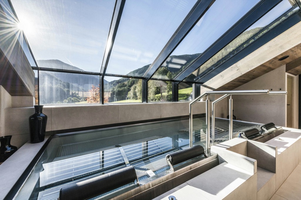 La splendida spa e la sala fitness possono essere prenotati gratuitamente. Nella vasca idromassaggio ci si sdraia sui getti e il panorama è il cielo: il soffitto sovrastante è una grande vetrata per ammirare le nuvole e le stelle. Un punto di osservazione inedito per un rilassamento totale. Un grande open space tutto a vetri, la luce e il paesaggio entrano nell’ambiente ordinato e geometrico: i lettini sospesi dove dondolare e sognare sono situati sopra un soffice “tappeto” di autentico muschio, per una sensazione avvolgente di benessere a stretto contatto con un materiale naturale, che ricorda il bosco.
