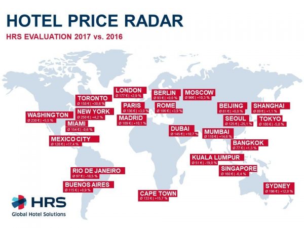 Sul lungo raggio, New York ha compensato il calo dei prezzi nel 2016 e ora raggiunge una media di 250 euro (+4,2%) per notte in hotel. Washington segue con 230 euro (+5,5%) al secondo posto. Il maggiore aumento dei prezzi è stato rilevato a Toronto, che con una crescita del 30,6% registra un prezzo medio di 158 euro – la ragione potrebbe essere la celebrazione del 150° anniversario dell’indipendenza del Canada, che si è festeggiato a Toronto durante l’intero anno. Prezzi in netto calo a Seul (- 25,1%), Kuala Lumpur (-20,3) e Rio de Janeiro (-19,8%).