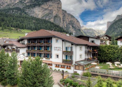 L’esterno dell’Hotel Tyrol incastonato fra le montagne gardenesi