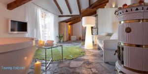 Seguono 2 Oswald Wolkenstein, molto grandi, 60 mq, che si trovano nella parte principale dell’albergo. Molto luminose, arredate con elementi di design che creano un bel contrasto con le travi di legno antico sul soffitto, pavimento in legno di larice altoatesino, cabina armadio, balcone e vista sulla Val d’Isarco. Poi altre 7 dalla personalità individuale: la suite della Torre con vista a 360 gradi: un vero gioiello. Si trova nella torre storica all’ultimo piano, e rappresenta così il punto più alto dell’intero albergo. E’ suddivisa su due piani: al primo piano si trova il soggiorno molto ampio con una stufa e il pavimento in legno di larice altoatesino e il bagno con vasca; salendo le scale si raggiunge la camera matrimoniale, il letto è posizionato su un soppalco che si affaccia sul soggiorno sottostante. La suite del Gufo che si trova nell’omonima torre e viene raggiunta attraversando la terrazza del gufo con la sua vista fantastica sullo Sciliar. Questa grande suite ha un soffitto mansardato molto alto con travi in legno, una piccola stanza singola separata, una deliziosa stufa colorata a mano e un pavimento in legno scuro; la suite Civetta, 63 mq, al terzo piano della torre storica, con vista sullo Sciliar, dispone di una vera stube antica con una stufa e una stanza da letto separata con elementi di design. Arredata con pavimento di quercia scura e stoffe tipiche di loden; la Wagenhaus si trova nel giardino, la torre più piccola del XIII secolo, una piccola e deliziosa struttura a sé stante.