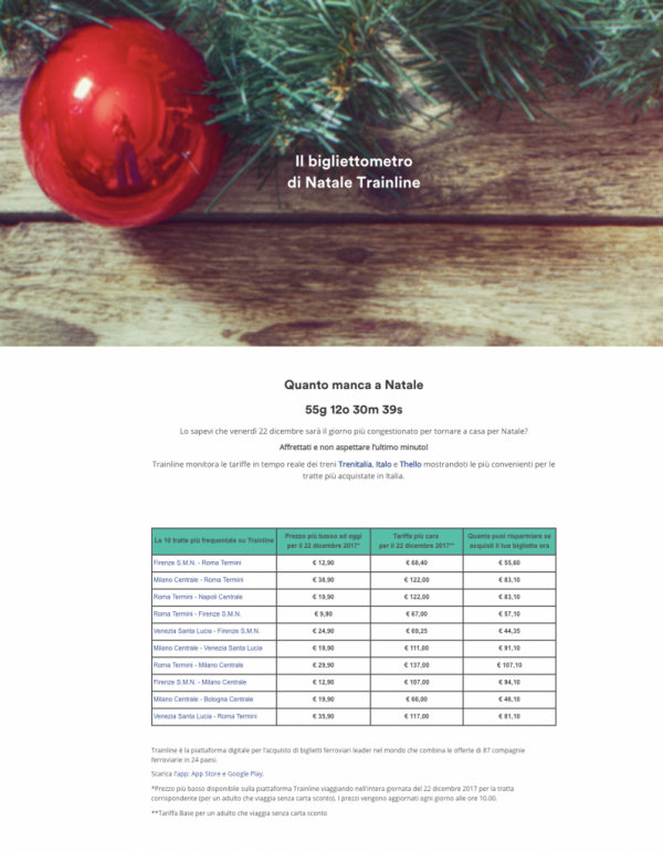 In occasione della Giornata mondiale del risparmio, Trainline ha creato il Bigliettometro di Natale, un sistema di monitoraggio continuo delle tariffe più vantaggiose per viaggiare in treno il 22 dicembre. A partire da oggi su trainline.it sarà possibile consultare i biglietti del treno più convenienti per un viaggio di Natale all’insegna del risparmio. Secondo un’analisi […]→