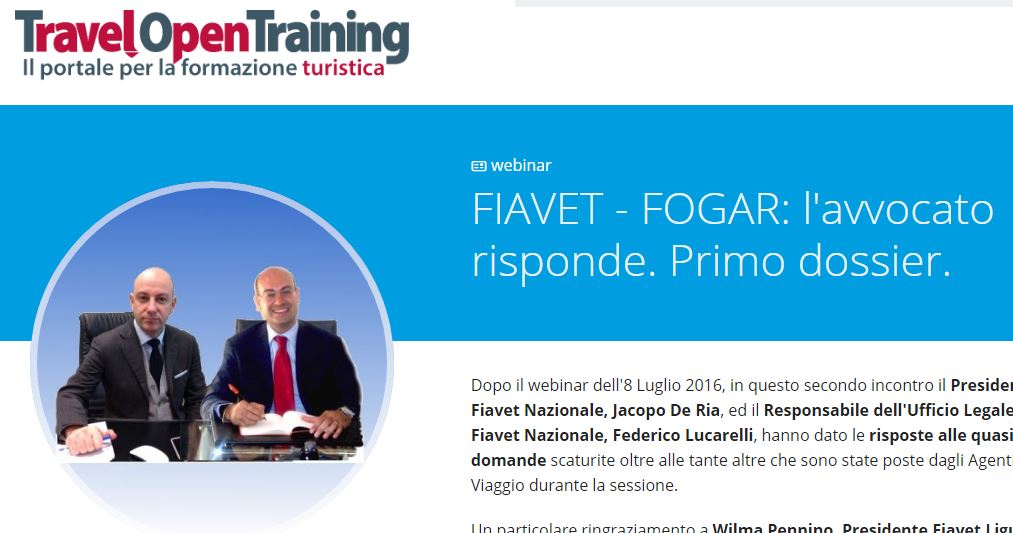 Si è svolto nel pomeriggio di ieri il secondo webinar Fiavet sul Fondo Fogar curato dal Gruppo Travel Quotidiano. Un secondo appuntamento resosi necessario dopo la prima puntata dell’8 luglio che ha registrato oltre 400 iscritti e più di 300 partecipanti attivi durante la sessione che hanno inondato di domande i relatori Jacopo De Ria, presidente Fiavet nazionale e l’avvocato Federico Lucarelli, responsabile legale dell’associazione. Tante, troppe le domande rimaste insolute, per mancanza di tempo, e ancora tantissime le nuove questioni e i nuovi dubbi sorti anche dopo l’approfondita spiegazione dell’avvocato Lucarelli. Così, nell’arco di pochi giorni il Gruppo Travel Quotidiano ha organizzato una nuova sessione, che grazie anche all’impegno della presidente Fiavet Liguria, Wilma Pennino, si è focalizzata esclusivamente su domande e risposte per gli agenti di viaggio e gli operatori.