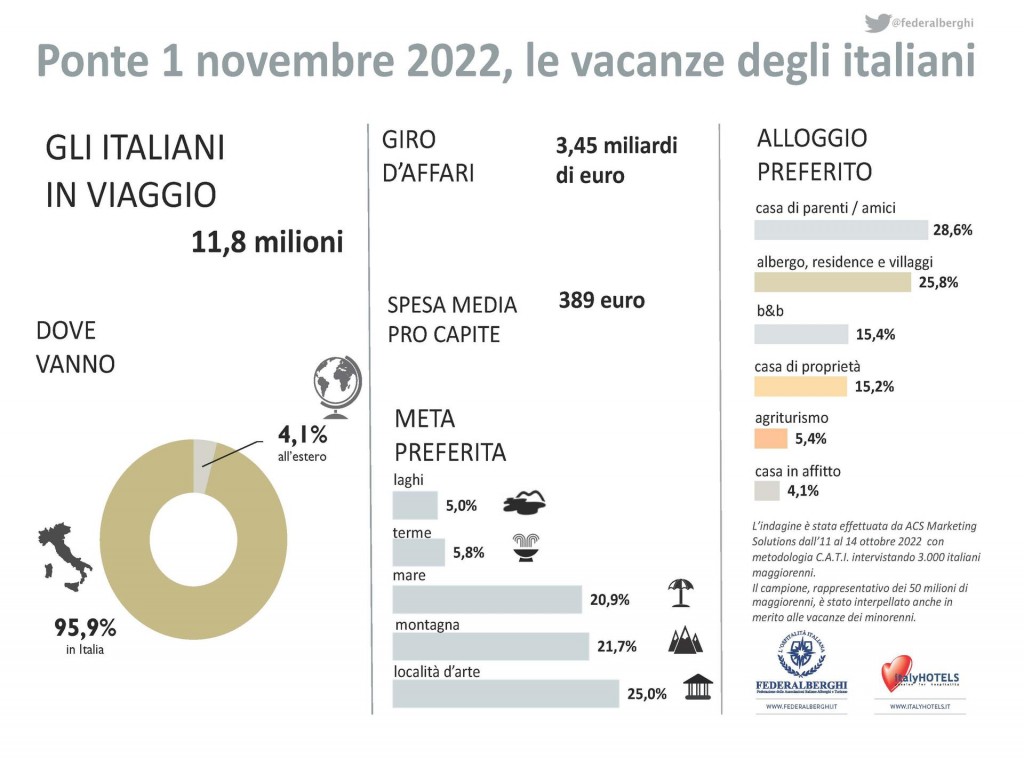 Il dato, emerso dall’indagine di Federalberghi con il supporto tecnico dell’Istituto ACS Marketing Solutions ed effettuata tra l’11 ed il 14 ottobre su un campione rappresentativo di oltre 3mila individui, mostra il movimento turistico degli italiani durante una festività che da sempre rappresenta una prima tregua dal lavoro dopo il periodo delle ferie estive.