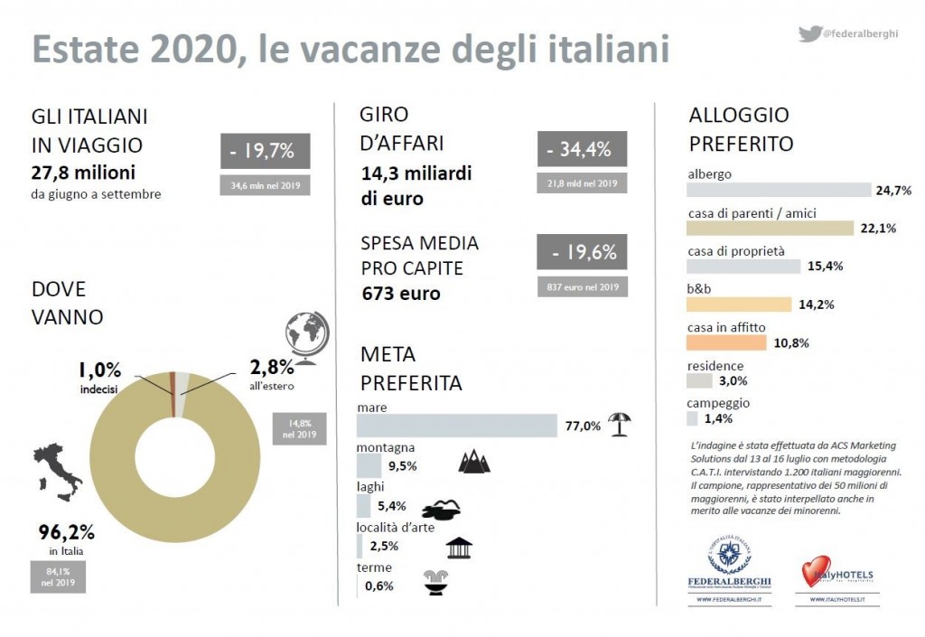 Il 96,2% degli italiani che ha effettuato o effettuerà una vacanza nel corso dell’estate rimarrà in Italia, per un totale di 26,7 milioni di persone. Anche se, complice il coronavirus, la quota di coloro che rimangono in Italia è cresciuta rispetto all’84,1% del 2019, il saldo è tragicamente negativo, con una diminuzione in valore assoluto di 2,4 milioni di persone. Il 2,8% andrà all’estero, mentre l’1,0% è ancora indeciso.