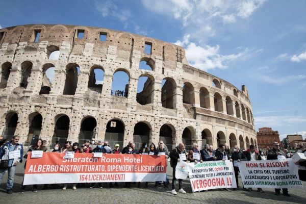 Il mondo del turismo unito al Colosseo: con questo grande e simbolico abbraccio i sindacati di settore, Filcams Cgil, Fisascat Cisl e Uiltucs, sono scesi in piazza insieme i lavoratori del settore, che hanno manifestato anche al Ponte di Rialto a Venezia, al parco Federico Fellini di Rimini, al Teatro Massimo di Palermo e al Bastione Saint Remy, a Cagliari.