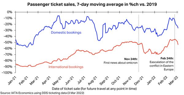 La Iata mostra i primi dati che confermano il preoccupante effetto della guerra in Ucraina sull’attività delle compagnie aeree. Il grafico mette in evidenza che nelle settimane precedenti al 24 febbraio, la domanda era su una traiettoria al rialzo. Con prenotazioni domestiche vicine al 90% dei dati pre-crisi e quelle internazionali che superavano il 50%.