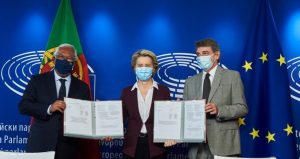 I vertici delle tre massime istituzioni europee (Parlamento, Consiglio e Commissione), Antonio Costa, primo ministro portoghese in rappresentanza degli Stati membri, Ursula von der Leyen, presidente della Commissione e David Sassoli, presidente del Parlamento, hanno siglato ieri il testo finale per l’entrata in vigore dei certificati che è confermata per il primo luglio.