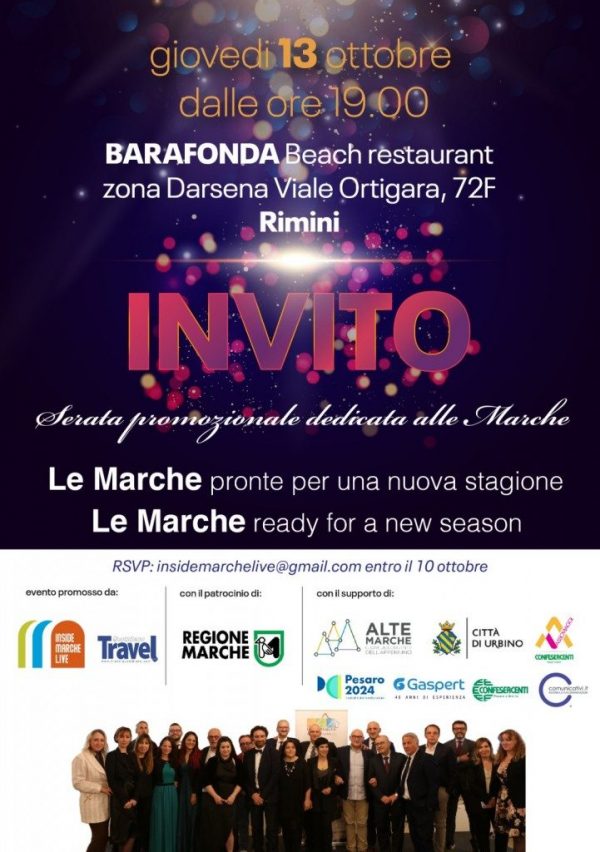Anche quest’anno, in occasione della 59° Fiera internazionale del turismo Ttg a Rimini l’Associazione dei tour operator incoming delle Marche, Inside Marche Live, propone un importante momento di promozione. L’appuntamento è per giovedì 13 ottobre alle ore 19.00 presso il Barafonda Beach Restaurant, location nella zona della Darsena di Rimini.