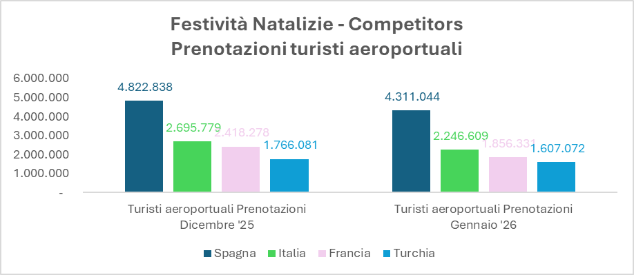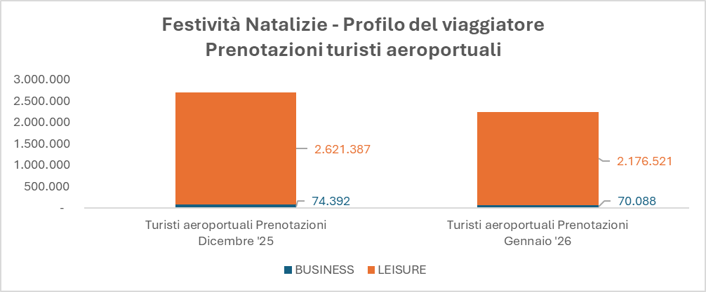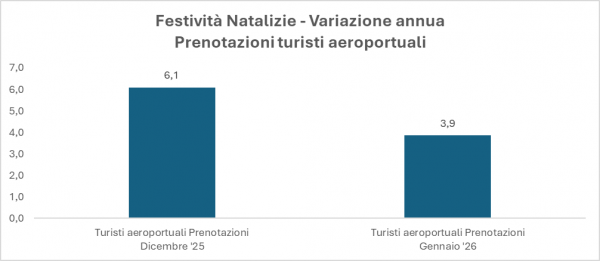 Con oltre 2,7 milioni di prenotazioni internazionali e domestiche di passeggeri aeroportuali che arriveranno in Italia nel mese di dicembre 2025, con una variazione annua del +3%, si conferma la tendenza positiva che ha caratterizzato l’intero anno trascorso (se si considerano solo i turisti soggiornanti si contano 2,4 milioni di arrivi aeroportuali, in crescita del +6,1% sull’anno precedente). Un trend di crescita che prosegue nel 2026 per il mese di gennaio con circa 2,3 milioni di prenotazioni aeroportuali, pari al + 3,9% sull’anno precedente (1,9 milioni soggiornanti, +4,4% sul 2025).