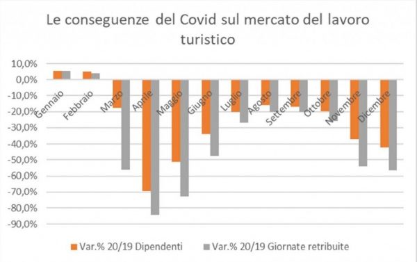 In termini di occupazione il lavoro a termine e stagionale è stato quindi quello le più penalizzate dalla crisi pandemica (-40,4% e -31,2%). Tuttavia, sottolinea la ricerca, tra chi aveva un contratto a tempo indeterminato c’è stata una riduzione del 19,1% degli occupati e del 34,6% delle giornate retribuite. In termini assoluti tra il 2019 ed il 2020 sono andati persi 144 mila posti di lavoro stabili. Si tratta di un numero troppo alto per pensare che sia semplicemente effetto del turnover naturale. Considerando che tuttora sussiste il blocco dei licenziamenti, si deduce perciò facilmente che una parte rilevante di lavoratori ha deciso di dimettersi ritenendo di non avere più prospettive nel settore.