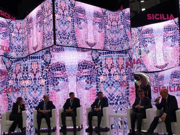 La Sicilia torna negli spazi di Fiera Milano City con uno stand di grande impatto visivo caratterizzato da grandi ledwall e superfici a specchio.