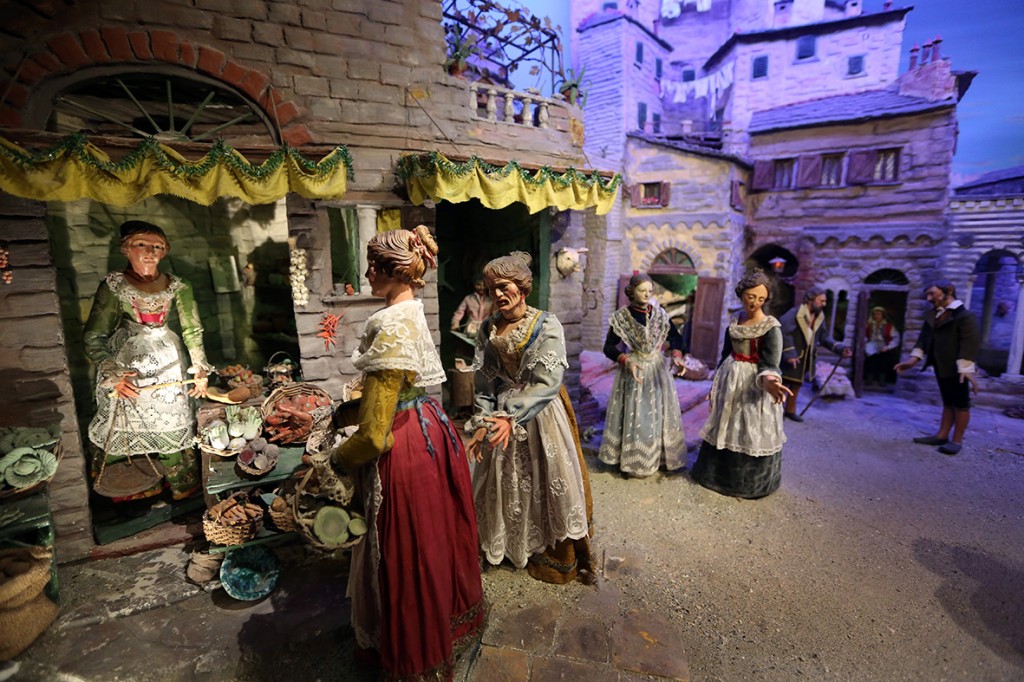 Si tratta di un presepe storico-artistico della tradizione ligure, che quest’anno si compone di statuine settecentesche provenienti dal Santuario di Nostra Signora del Monte, la maggior parte delle quali realizzate dalla bottega di Pasquale Navone (Genova 1746-1791), il più prolifico scultore settecentesco impegnato nella creazione di figure presepiali.