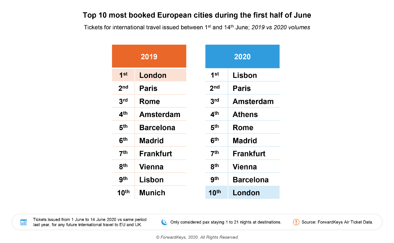Nel frattempo Lisbona è salito in cima alla lista delle città europee più prenotate nella prima metà di giugno, rispetto a sedersi vicino al fondo al nono posto nel 2019.