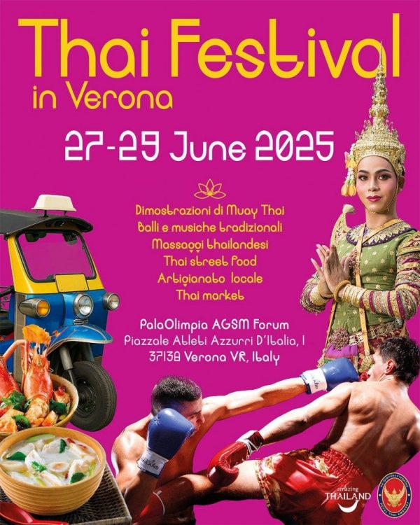 L’Ente Nazionale per il Turismo Thailandese in collaborazione con l’Ambasciata Reale di Thailandia danno appuntamento a Verona, dal 27 al 29 giugno prossimi, per il primo Thai Festival: all’interno del PalaOlimpia Agsm Forum (Piazzale Atleti Azzurri d’Italia 1) darà un vero e proprio viaggio sensoriale tra colori, profumi e tradizioni, che porterà nella città veneta il meglio della cultura thailandese, tra arte, gastronomia, spiritualità e spettacolo.