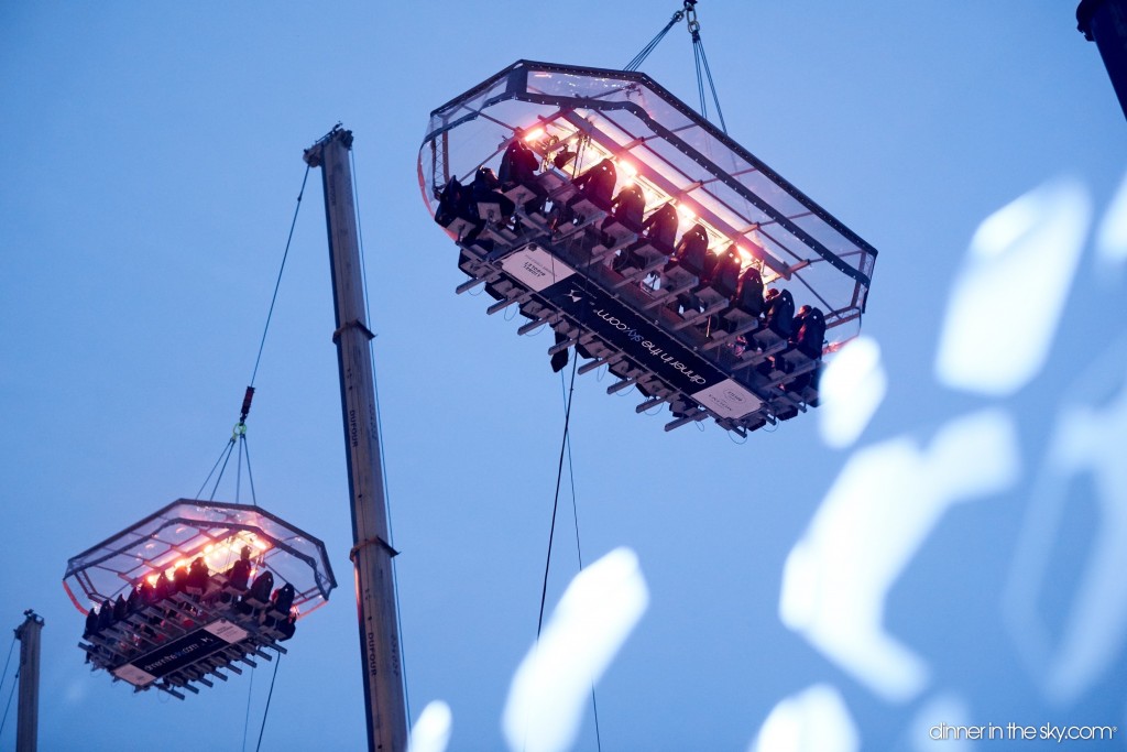 Ideata da David Ghysels, “Dinner in the Sky” rappresenta l’occasione ideale per trasformare qualcosa di ordinario, come un pranzo o una cena, in un momento magico e indimenticabile. L’esperienza comincia ancora con i piedi “per terra”: all’arrivo gli ospiti vengono infatti accompagnati in una zona “hospitality” per un briefing e un aperitivo di benvenuto. Due alla volta, poi, accedono alla piattaforma e prendono posto su speciali sedili girevoli, simili a quelli dei piloti di Formula 1, che permettono di ruotare su se stessi, spaziando dalla tavola … al vuoto.