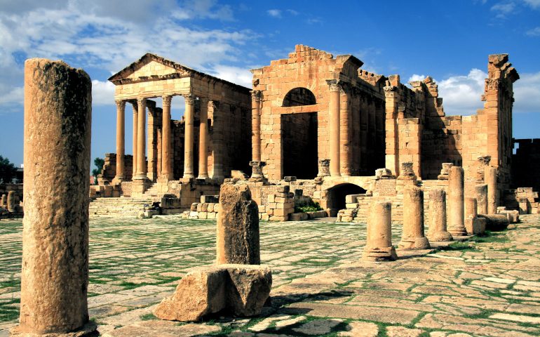 Nella zona occidentale della Tunisia, l’archeologia è al centro di visite ed escursioni molto interessanti. Tra palme e uliveti si trovano El Kef e Sbeitla (nella foto), un tempo importanti presidi romani ed oggi preziose testimonianze di una storia senza tempo. Situata nella valle di wadi Mellègue, El Kef è una cittadina legata all’agricoltura e ad una cultura preistorica magico-religiosa. Studi approfonditi, sostenuti dalla presenza del tempio dedicato a Venere, confermano che El Kef occupa il sito di Sicca Venaria, antica città cartaginese successivamente caduta sotto il dominio romano. Oggi El Kef non solo conserva le antiche vestigia ma è uno strategico snodo commerciale e stradale sulla rotta per l’Algeria. Queste zone sono infatti conosciute per le coltivazioni di grano, allevamento di bestiame e miniere. Attorno alla fonte di Ras el-Ain, situato tra i due wadi el-Ain e Bin Smida, si trova Le Temple des Eaux – Il tempio delle Acque – un complesso termale di epoca romana di cui è stata ritrovata solo la metà. Di fronte al tempio, nella zona delle case patrizie, si trovano le cisterne la cui acqua proviene dalla sorgente di Ain Soltan. Ai piedi della moschea di Sidi Ahmed Ghrib ecco la piazza di Ras el-Ain, la grande fonte di Kef che ha permesso alla città di svilupparsi floridamente. A 125 km da El Kef e a 260 km da Tunisi sorge Sbeitla. Situata a 525 m di altitudine, Sbeitla è una cittadina di forte testimonianza storica, in particolare legata alla Roma Antica. Le più antiche tracce di civilizzazione riguardano steli funerarie, megaliti punici e resti della sottomissione del regno dell’imperatore Vespasiano e di suo figlio Tito. Alcune iscrizioni trovate testimoniano l’antico commercio dell’olio, motivo di forte prosperità della città. Nelle vicinanze di Sbeitla si trova il sito archeologico di Sufetula. Il sito è caratterizzato dal complesso del Capitolium, un tempo centro politico, sociale e commerciale della cittadina. I tre templi affiancati, che costituiscono l’ingresso al sito, sono dedicati alla Triade Capitolina – Giove, Giunone e Minerva -; l’ingresso al Foro è invece conosciuto come la Porta di Antonino, con iscrizioni dedicate allo stesso e ai suoi figli Lucio, Vero e Marco Aurelio.