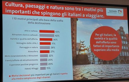 «Gli italiani, più degli altri visitatori europei, visitano la Germania per l’arte e la cultura, per la varietà e qualità dell’offerta, per le città con la loro architettura e per l’atmosfera dei piccoli borghi. Secondo l’indagine, che ha coinvolto diverse tipologie di to e adv, oltre alle prenotazioni individuali, il nostro ospite è più giovane rispetto al passato; ha in media 46,5 anni e torna in Germania molto volentieri. Nel 66% dei casi è un repeater, quindi ha già visitato la Germania tra una e tre volte, ma anche più di quattro volte. Il 29% dei nostri ospiti ha figli a carico, per il 51% ama fare i City trips, mentre il 26% sceglie i viaggi itineranti. In entrambi i casi il viaggiatore si ferma più a lungo, in media 5,8 giorni. Il soggiorno si allunga nei periodi di picco in estate e in inverno – in corrispondenza delle ferie scolastiche; per il 68% si tratta di viaggi Leisure, mentre il Business ha ripreso quota rispetto al pre-pandemia e ha raggiunto il 20%, configurandosi secondo le nuove forme del bleisure e della workation.
