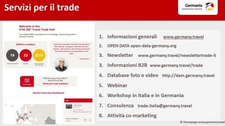 Abbiamo pensato a tanti servizi per il trade e per noi è molto importante il progetto open-data-germany.org: “una soluzione fondamentale per affrontare i cambiamenti tecnologici e commerciali che stanno plasmando il settore turistico globale”. I dati resi pubblici dell’Engt, degli enti regionali di promozione turistica e delle 11 Magic Cities iconiche della Germania ci aiuteranno a integrare e combinare i nostri dati con il vostro lavoro. L’Engt realizza delle campagne di comunicazione e collaborazione con i to e c’è la possibilità di inserire nei siti delle adv dei widget che portano a diverse piattaforme di prenotazione. Come il widget natalizio o quello sulla natura e la famiglia. È un servizio gratuito. Abbiamo una newsletter bimestrale, un database di foto e video, realizziamo webinar e workshop, attività di co-marketing e siamo sempre a vostra disposizione per una consulenza».