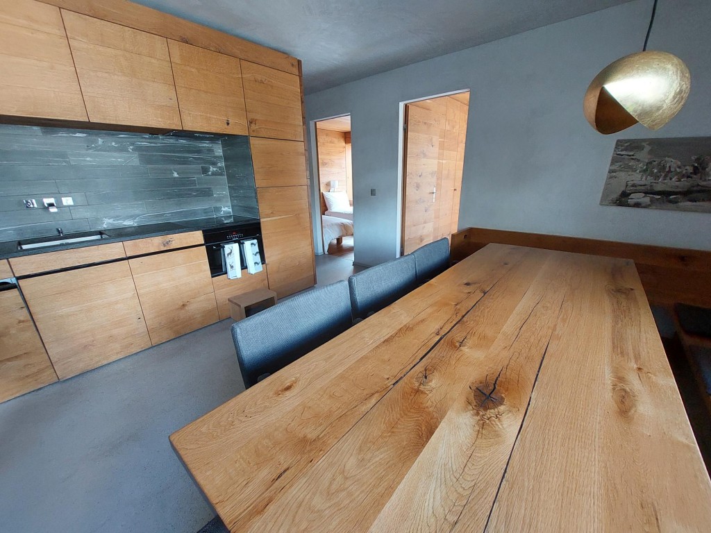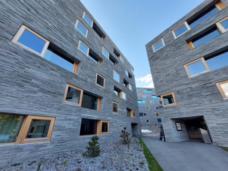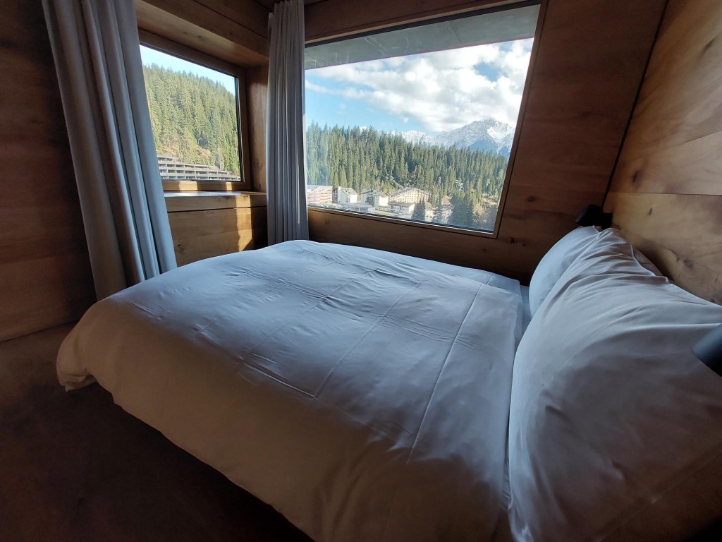 «Nel 2008 Reto Gurtner, presidente e ceo del Weisse Arena Gruppe, ha voluto creare un luogo unico. – racconta Martina Calonder, pr manager del Weisse Arena Gruppe – In quello che era un vasto parcheggio sono stati costruiti 7 edifici a forma di cubo, oggi sono 13. All’esterno sono ricoperti da una speciale qualità di quarzite, all’interno c’è molto legno locale. Le forme sono semplici, senza tempo e architettonicamente moderne, anche se hanno più di 15 anni. I 13 cubi sono disposti in modo casuale, secondo angolazioni diverse, e ricordano la disposizione diffusa delle rocce lasciate dall’evento geologico che sconvolse la valle 10mila anni fa. Reto Gurtner è un appassionato del digitale e della tecnologia e fu lungimirante.