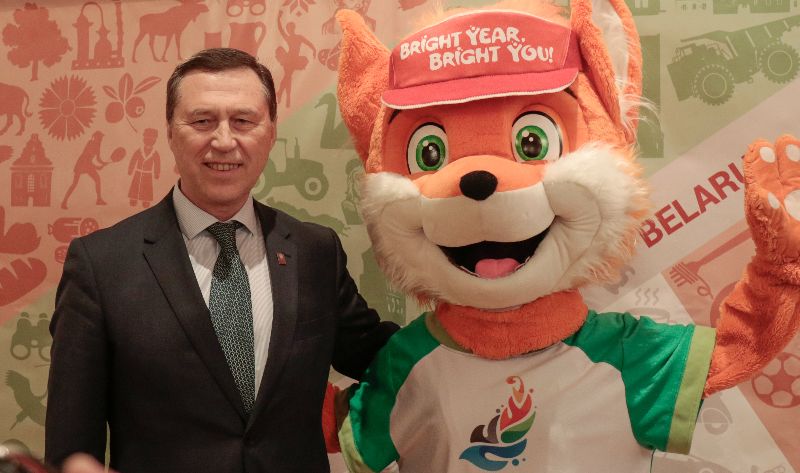 George Katulin, ceo del Minsk european games organising committee e Lesik, la mascotte della seconda edizione degli European Games
