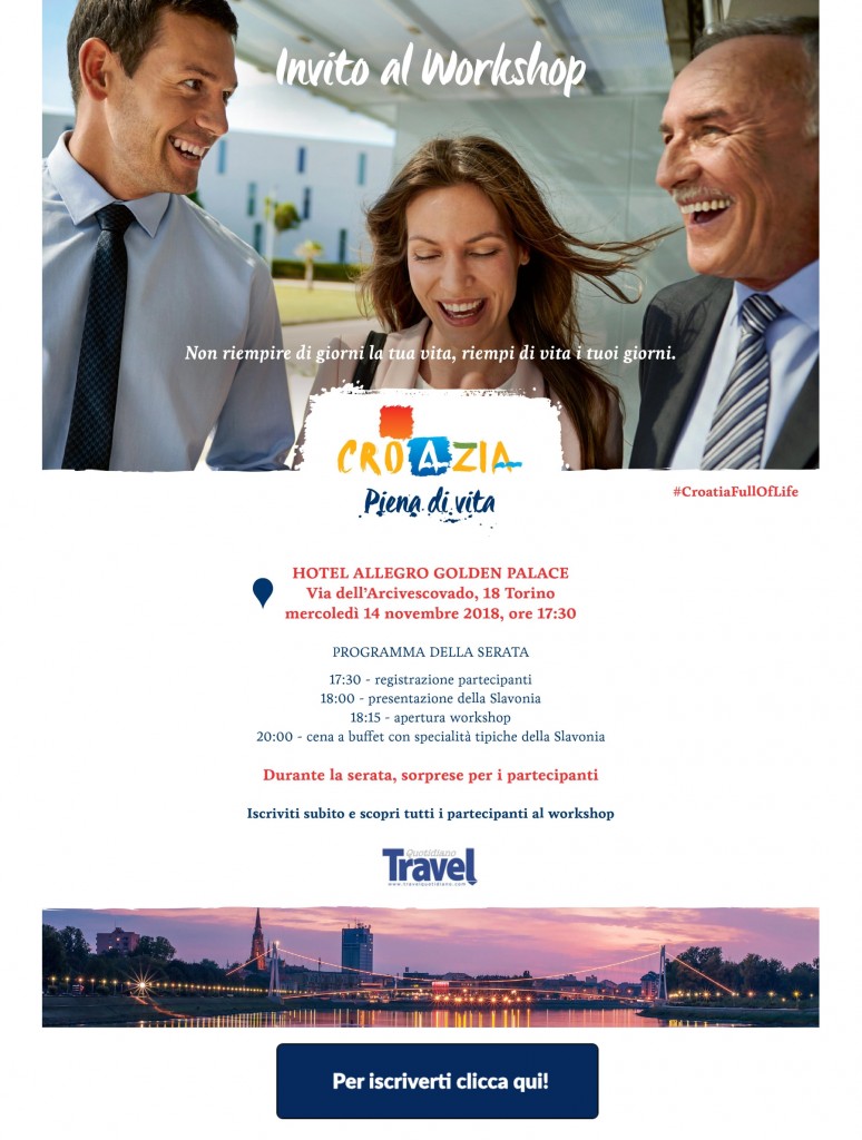 Vi aspettiamo a Torino il 14 novembre dalle ore 17.30 per partecipare al workshop dell’ente del turismo croato: iscrivetevi qui. Circa venti gli espositori presenti, molti dei quali per la prima volta in Italia: durante la serata saranno riservate grandi sorprese alle agenzie di viaggio presenti! L’evento si svolgerà all’hotel Allegro Golden Palace in via dell’Arcivescovado 18, vi aspettiamo numerosi. Cliccate qui per scoprire il programma della serata.