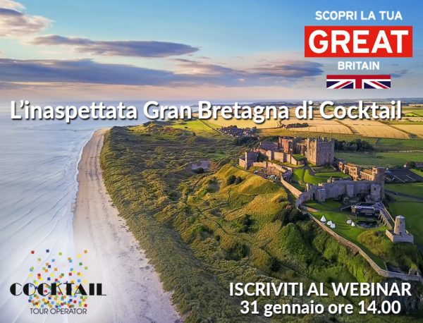 Appuntamento con una Gran Bretagna alternativa, ancora tutta da scoprire e da vivere all’insegna delle esperienze. Giovedì 31 gennaio 2019 alle ore 14 appuntamento con il webinar dedicato all'”L’inaspettata Gran Bretagna di Cocktail”, realizzato in collaborazione con il gruppo Travel. L’incontro gestito sulla piattaforma Travel Open Training e dedicato alla formazione degli agenti di viaggio vedrà la presenza di due relatori d’eccezione: Simona Blandi, responsabile b2b di Visit Britain e Gabriella Broggi, responsabile programmazione di Cocktail Viaggi. Novità, eventi, aree ancora da scoprire, proposte inedite by Cocktail Viaggi saranno al centro di un appuntamento da non perdere. Per iscriversi, è sufficiente cliccare a questo link e registrarsi online.