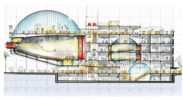 Lo storico Saban Building vedrà l’aggiunta di una nuova sezione, sferica, nella parte nord con vista sulle colline di Hollywood. Il design del nuovo museo è stato ispirato dalla mission del museo stesso: far entrare il visitatore nello schermo e fargli vivere il back stage nel mondo creativo del “film making” attraverso la lente di chi ha creato l’industria del “motion picture”.
