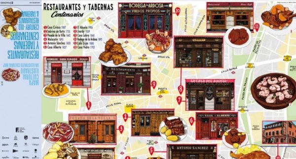 “Il patrimonio storico di Madrid non è costituito solo da grandi monumenti, palazzi e cattedrali. È anche composto da negozi e ristoranti leggendari che costituiscono l’eredità della nostra città, fungendo da potente attrazione turistica e generazione di ricchezza “, si legge nella proposta del Consiglio Comunale. Tutte le informazioni sui dodici ristoranti “testimoni della storia” di Madrid si possono consultare in questa mappa, illustrata da Mario Jorda in inglese e in spagnolo.