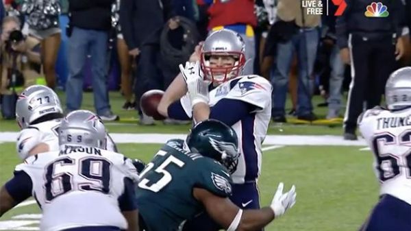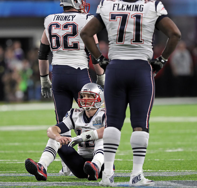 (Minneapolis, MN, 04/04/18) New England Patriots quarterback Tom Brady sit on the field after he was stripped sacked by the Philadelphia Eagles during the fourth quarter of Super Bowl LII against the Philadelphia Eagles at the U.S. Bank Stadium on Monday, April 04, 2018. Staff photo by Matt Stone